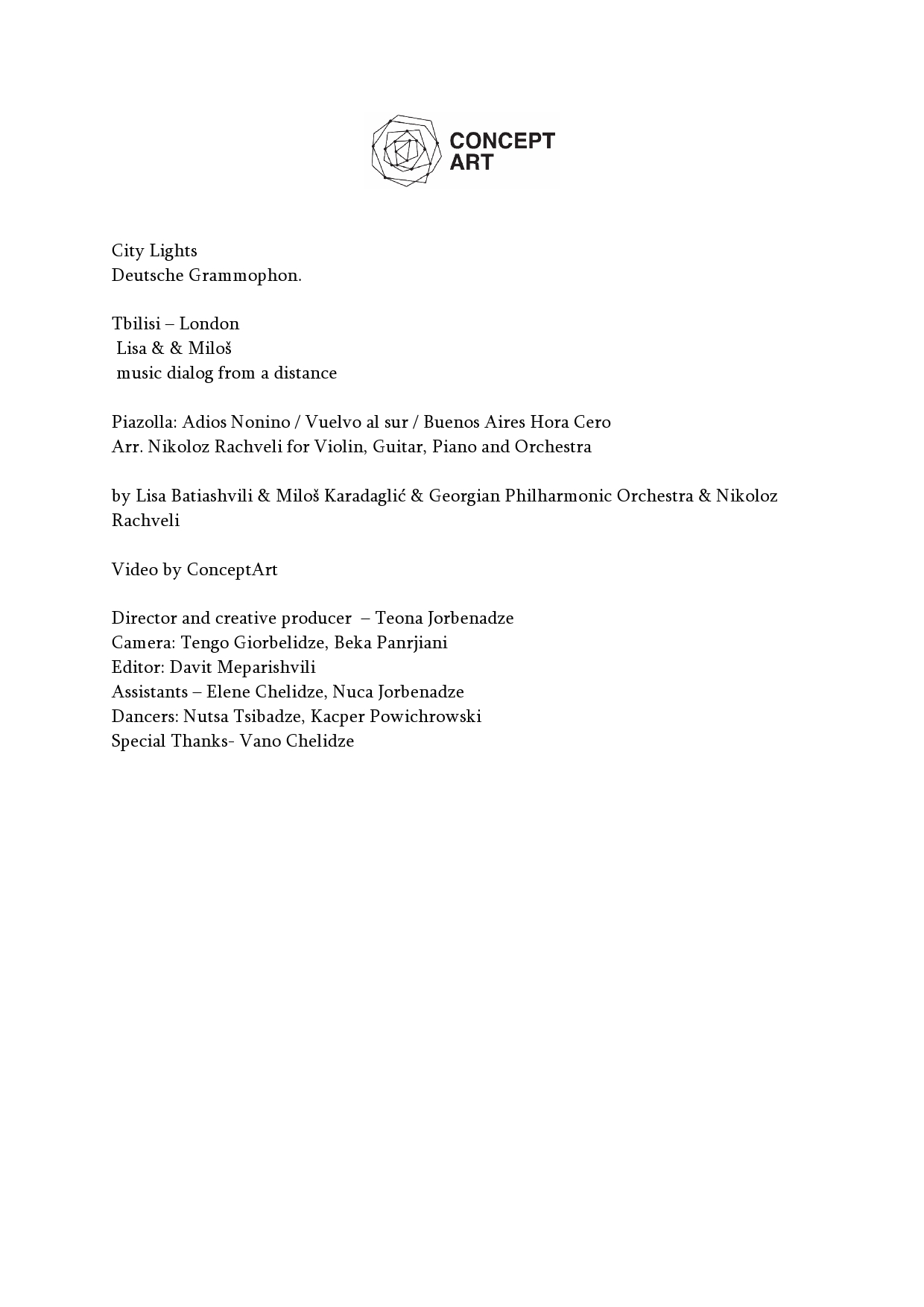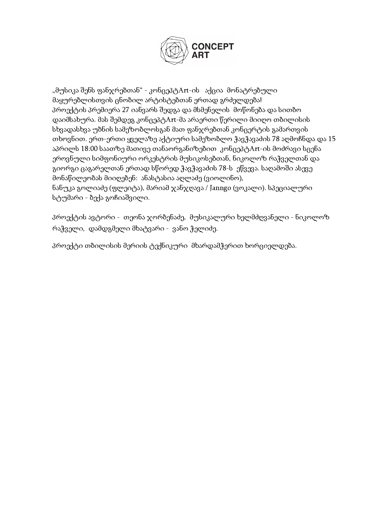 press material Here you find official and downloadable press material for all current projects. For additional information please contact us: info@conceptart.ge ConceptArt & ZOMA & Nikoloz Rachveli press release poster ConceptArt & ZOMA press release poster City Lights press release poster Music at your window #3 press release poster
